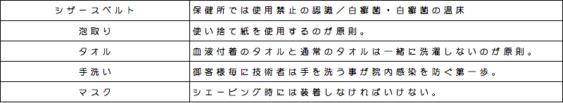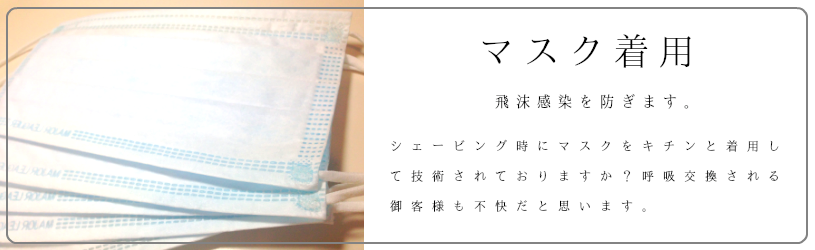 シェービング時には御客様との直接呼吸交換を避けるため、必ず装着しなければいけない。インフルエンザや結核などの飛沫感染を防ぐ為の予防策。消毒薬や消毒器などでは防ぎきれない「空間」による唯一の院内感染対策です。しかし残念ながら、唯一の対策を怠る技術者が多いのも事実。これも、シザースベルトと並んで御客様にとっては、お店の衛生管理への考え方を判断する基準になるのかもしれません。