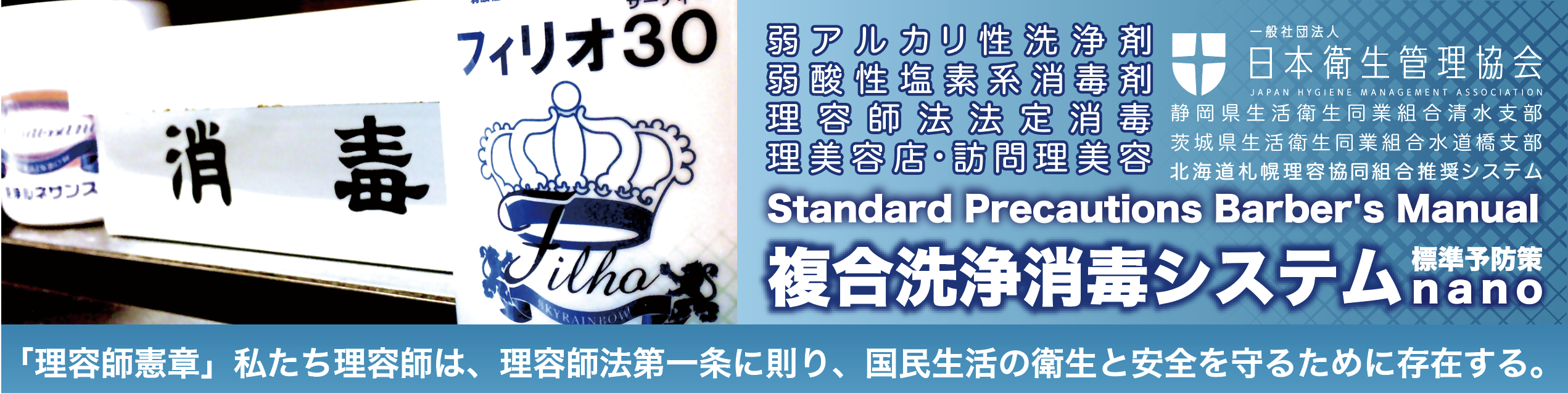 抗菌スペクトラムが広く最も強力な消毒剤の一つとして知られる「次亜塩素酸ナトリウム(NaClO)」は弱酸性領域にすることで塩素化学種の最も強い「次亜塩素酸(HClO)」となり、更に強い除菌効果が発揮されることは広く知られてます。塩酸などの酸を混ぜないで弱酸性に安定化させた特許製法(2015年1月特許取得)による次亜塩素酸弱酸性水溶液・フィリオ30に特許成分のナノ洗浄の効果を加えることで、油脂の汚れの分散除去と油脂に馴染みやすいことで、訪問理容などの特殊環境下での使用およびシェービングブラシの管理に適した弱酸性次亜塩素酸洗浄剤「フィリオ30ナノ」が生まれました。