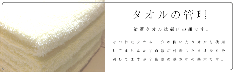 通常のタオルは、洗濯機で洗剤を入れて洗濯してから干す事により消毒は完了します。ただし、血液付着のタオルを一緒に洗濯機で洗う事は大変危険な行為です。HBVの感染力は非常に強く、洗濯槽内のタオル全体が汚染されると思ってください。他の消毒器も含め、理容店で使用する機器(紫外線消毒器/蒸し器/煮沸消毒器/洗濯機)などは、事前消毒された上での二次使用と考えてください。血液付着があるタオルは、水洗いして入念に血液を洗い流します。そして、塩素系消毒剤による作業を経てからの洗濯機による洗浄作業になります。地域の感染源にならぬように、手間を惜しまないでください。