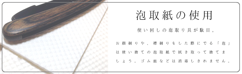 顔剃りや襟剃り石鹸の時に泡と剃った毛(ヒゲ)を付けるもの。使い捨ての紙を使用するのが原則です。ゴム皿やスポンジなどの再利用できるタイプのを使い回すのは厳禁です。消毒液に漬け置き消毒するとしても、剃刀の刃から泡を拭う際につける細かい傷の中に細菌などが入り込み、殺菌しきれず二次感染の危険があります。経費的にも、使い捨ての紙タイプを使用するのが「公衆衛生」として原則になります。