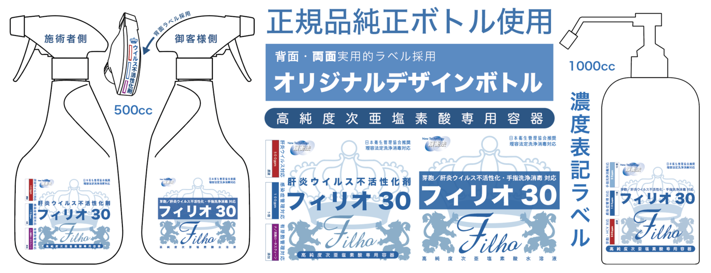 理容店における複合消毒システムで洗浄消毒剤として使用するのは、緩衝式生成法のフィリオ30という高濃度の弱酸性次亜塩素酸水であり、国際特許出願中のイオン交換フィルターから生成されます。これはナトリウムを水素に変換させるイオン交換フィルター独自の特性によるものです。この特許出願中生成法の為に、この生成法による高濃度弱酸性次亜塩素酸水こそ、のフィリオ30(サーティー)となります。この特許生成法の為に、この生成法による高濃度弱酸性次亜塩素酸水はフィリオ30以外には存在しません。生成方法としては次亜塩素酸ナトリウムと水をイオン交換フィルターにて濾過させる事により、高濃度の次亜塩素酸水が生成されます。フィルターで不純物も濾過されるために、純度/濃度が高い次亜塩素酸水の状態になり、結果的に弱酸性域で安定いたします。フィリオ30における検査として第三者検査機関である財団法人北里環境科学センターに株式会社スカイレインボー社が依頼した結果は以下の通りです。「C型肝炎ウイルス(代替ウイルス:ウシ下痢症ウイルス)/試験有効塩素濃度414ppm/作用不活性化効果時間30秒」「血液汚染器具の除蛋白効果実験/試験有効塩素農奴330ppm/作用効果時間30秒」「血液負荷かけた芽胞菌(枯草菌)/試験有効塩素濃度330ppm/作用溶菌化効果時間1分」これら検査結果において他生成法および低濃度の弱酸性次亜塩素酸水には、次亜塩素酸分子以外の不純物が多いなどの理由で参考にはなりません。また、これから述べる次亜塩素酸分子の酸化(溶菌/不活性化)プロセスにおいても、あえて不純物の少ない高純度/高濃度500ppmの弱酸性次亜塩素酸水であるフィリオ30におけるものと考えます。
