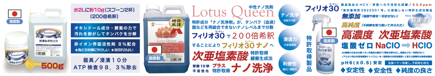 販売業者の「これも同じ」と性質が異なる次亜塩素酸製品を売られたり、法定濃度に満たないアルコール製品、さらには「病院で使われている」「軍隊で使われている」「ものすごく強力」などという言葉を信じ無意味な散財をするより、「正しい衛生管理品」を使用していただきたいからです。ポイントや大量在庫で価格を抑える業者にはできない「鮮度」という「感染症衛生管理」に重要なこだわりもあります。