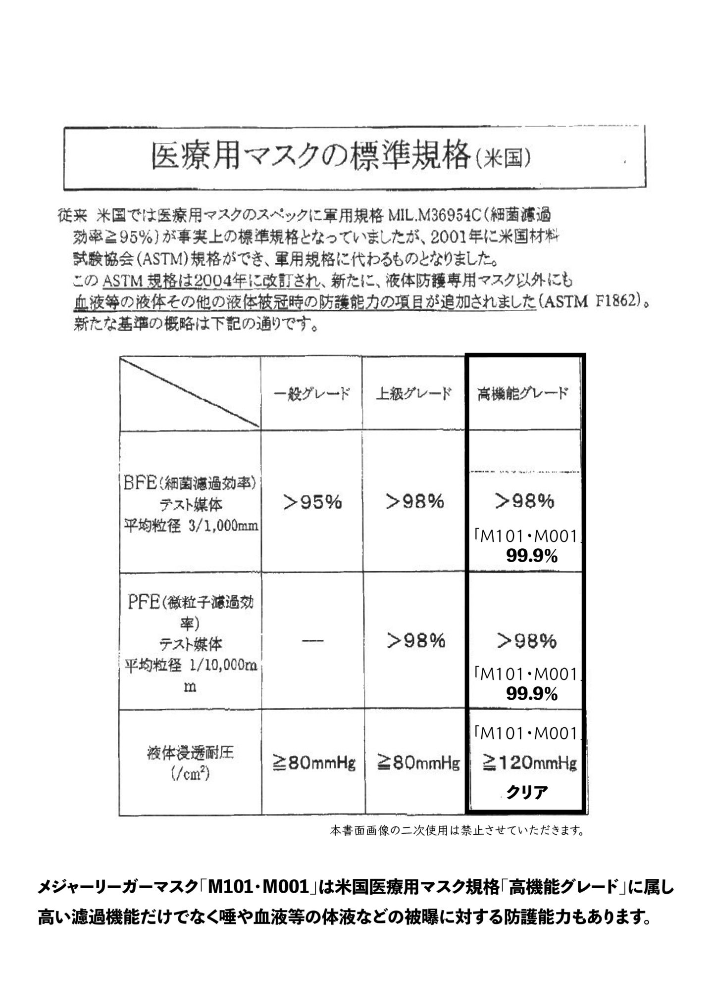| 花粉症(PM30)・風邪対策レベルの非医療用マスクではなく、結核菌(PM2)・インフルエンザ ウイルス/コロナウイルス(PM0.1)/血液・飛沫被爆対応の国内外クラス2医療用マスク採用 | |||||||