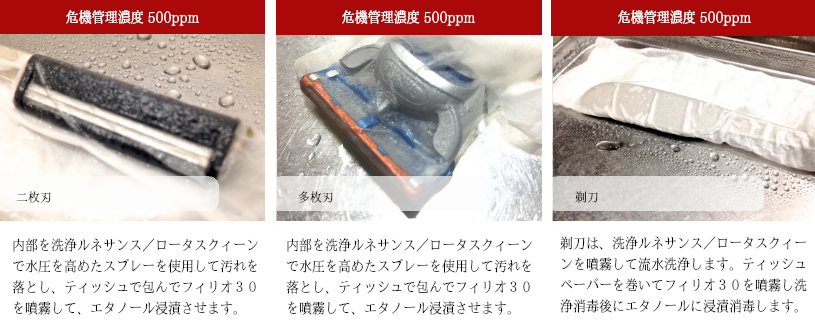 フィリオ30の原液500ppmを「危機管理濃度」として使用し、対象物の血液負荷状態を想定しています。血液を想定するという事は、蛋白質汚染であり、その先には汗なども含まれると考えます。また、対象物の使用状態/目的により100ppm(五倍希釈)を「衛生管理濃度」、50ppm(十倍希釈)を「衛生環境濃度」として、水で希釈して使用すます。「衛生管理濃度」「衛生環境濃度」は、対象物へ直接噴霧して使用するが、危機管理濃度として500ppmの原液を使用する際に、システムの特徴として「ティッシュペーパー」を使用する事にあります。実際の作業とすると、使用済み剃刀を流水で洗浄をします。その後、剃刀をティッシュペーパーで挟むように包み込み、フィリオ30を満遍なく十分に噴霧。放置後に、ティッシュペーパーで余分な水分を拭き取り後に廃棄して、剃刀は第二次基礎消毒「エタノール溶液浸漬」へ移行いたします。多枚刃などの剃刀でも、挟んだティッシュペーパーに満遍なく十分に噴霧する事により、対象物に次亜塩素酸が密着して浸漬効果となります。放置後の剃刀などについた水分をティッシュペーパーで拭くことができ、作業工程も容易になる訳です。従来は水分を拭く作業には清潔な布などが指定されていたが、ティッシュペーパーであれば使用毎の使い捨てになります。ウェットティッシュよりもコストは安く、使用するフィリオ30も平均5cc程で済む為にコスト的にも優れています。容易な事とコストは営業形態問わず重要な事であり、継続性に繋がるシステムといえます。