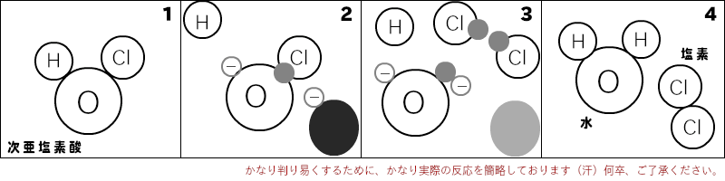 有機物(蛋白質)を見つけちゃうと、酸素(O)は水素(H)から電子を奪ってポイッと離しちゃいます。残った陰電子を帯びた(イオン化した)酸素(O・)と塩素(Cl・)は「ラジカル」という険悪な不安定な関係になります。ちなみにこの状態は「ClO・」となり、一酸化塩素ラジカルという不安定~ラジカル反応状態になります。次亜塩素酸(HClO)と共にpH状態で存在する「OCl-」も同じ構成ですが、こちらは「次亜塩素酸イオン」といい、有機物(蛋白質)などから電子を奪う酸化作用は起きるものの、安定した関係(不安定ながらも未練がある関係?)なので酸化反応速度(攻撃力)が違います。
