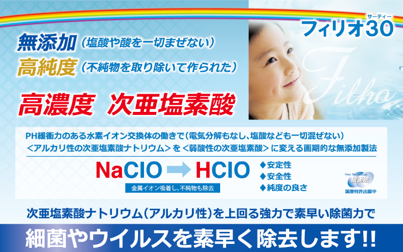 次亜塩素酸においては、多くの商品が出回っております。しかし、下記の国が定める次亜塩素酸のガイドラインである食安基発第0825001号に含まれておらず、HCVなどに有効(製品独自の第三者検査機関によるHCV不活性化試験結果による)濃度500ppmなのは特許生成法の次亜塩素酸弱酸性水溶液のフィリオ30だけです。