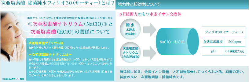 生成過程で、「次亜塩素酸ナトリウム」と「水」以外が含まれない事が大事。また殺菌作用がある「次亜塩素酸」以外の不純物が含まれないということ。また、原材料として使用している次亜塩素酸ナトリウムは「特級」(最高ランク)のものを使用しております。