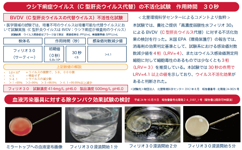 - 医療器具用洗浄液「高濃度次亜塩素酸弱酸性水溶液・フィリオ 30」;原液使用 (有効塩素濃度 500 mg/L、pH 6.0 ± 0.5)(実測値:有効塩素濃度 356mg/L、pH6.0)